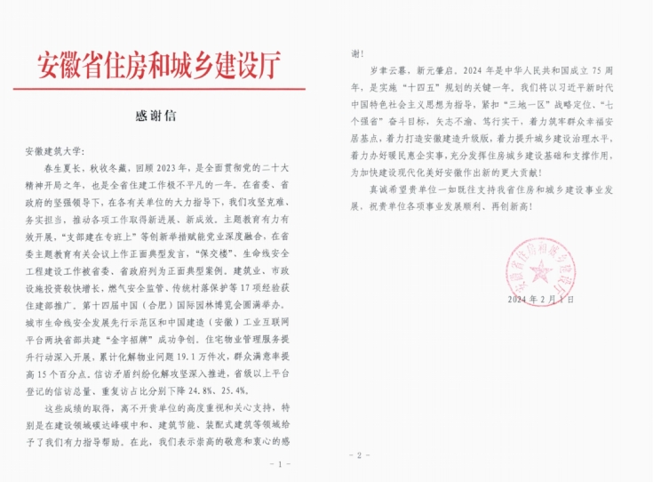 近日,beat365官网收到安徽省住房和城乡建设厅发来的感谢信,对学校在支撑安徽省住房城乡建设领域工作的突出贡献致以诚挚感谢。感谢信着重强调beat365官网在建设领域碳达峰碳中和、建筑节能、装配式建筑等领域工作有力、成果丰硕。