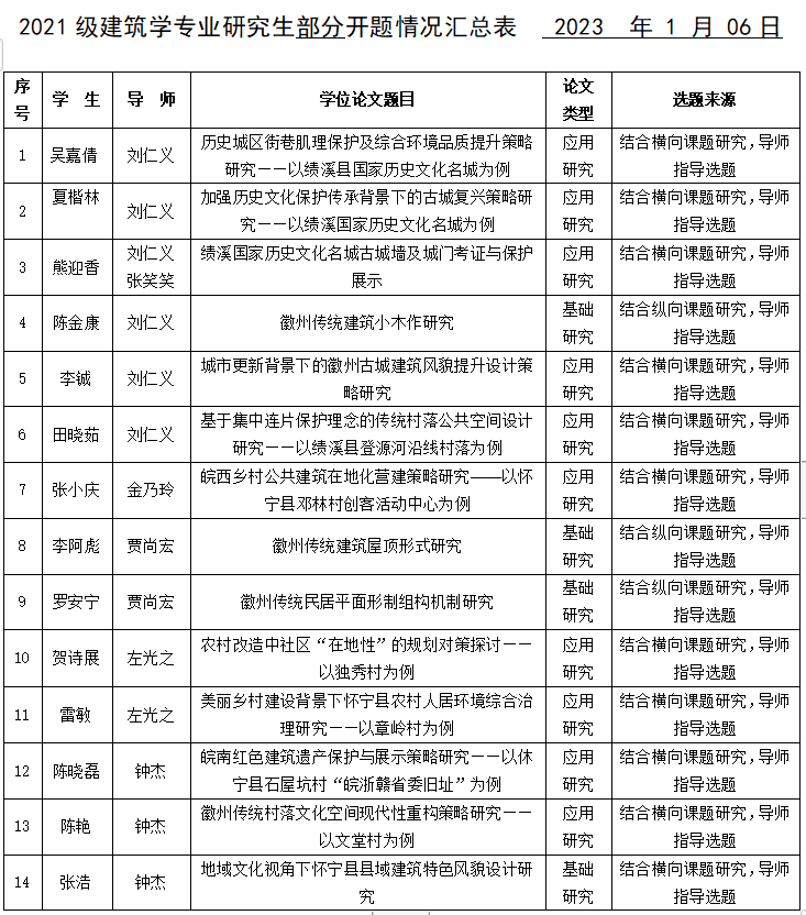 实验室核心团队紧密结合科研项目,根据相关课程要求,聚焦历史文化保护和徽州传统聚落与古建筑研究成果,广泛推广应用与教学活动,彰显课程特色,坚持走打好“建”字牌,做好“徽”文章的特色发展之路,求真务实,开拓进取,为建设国内一流、特色鲜明的高水平建筑大学努力贡献自己的力量。如:张笑笑副教授等开设的《徽州聚落与建筑》通识课程覆盖全校本科生教育,建筑学、城乡规划、风景园林等专业紧密结合课程设计开展徽州聚落与古建筑相关实践课题;钟杰副教授等策划国内五校建筑学专业联合毕业设计选题“古城复兴——绩溪古城展示线路(一期)提升改造设计”等。据不完全统计,建筑与规划学院硕士研究生学位论文有近50%选题与徽州传统聚落与古建筑和历史文化遗产保护相关。
