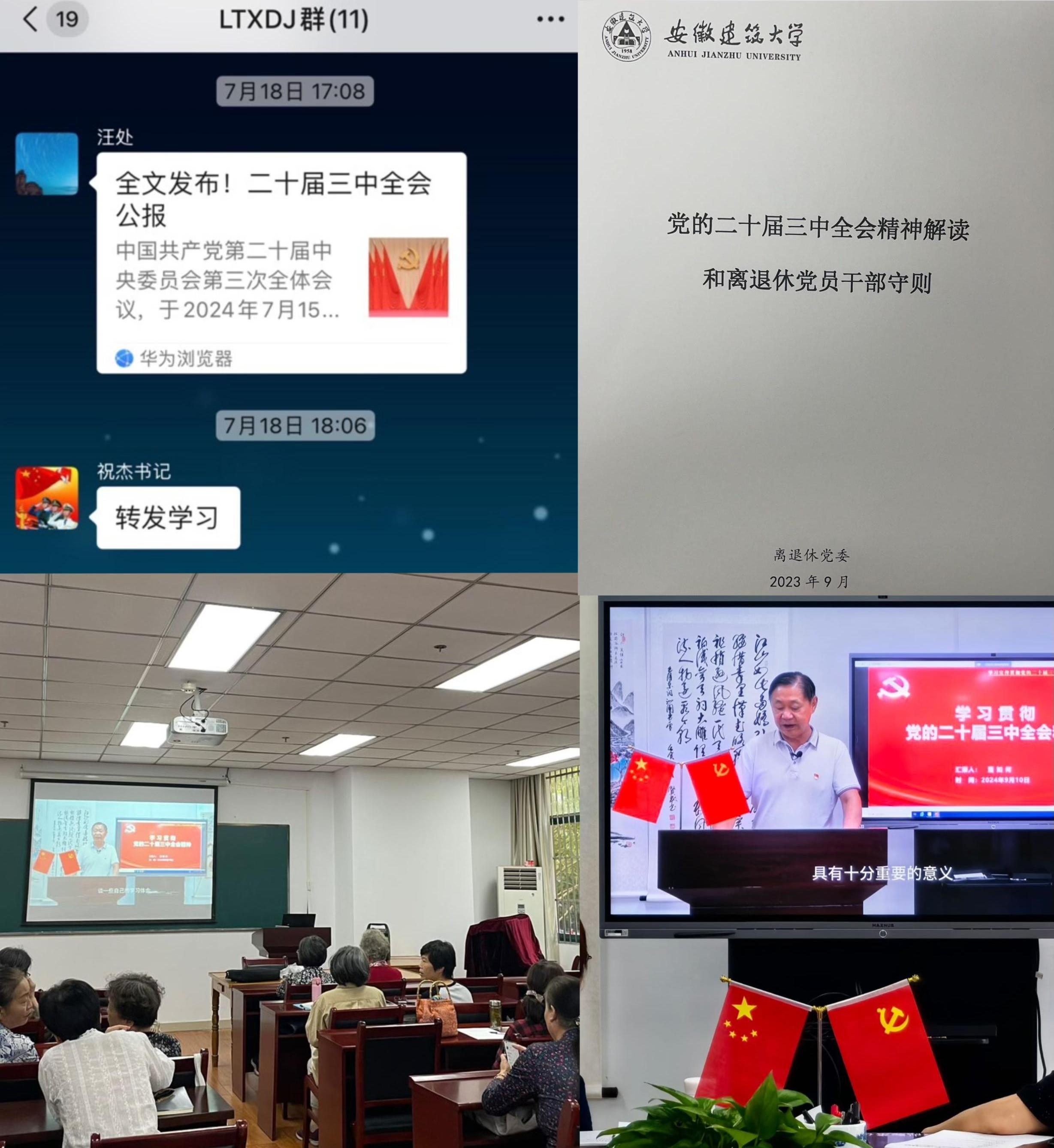 715日,党的二十届三中全会召开,离退休党委积极引导广大离退休党员干部收看大会盛况,并将党的二十届三中全会精神等学习资料及时发布在微信群。另外,离退休党委还通过老年大学课前播放微党课视频,发放党的二十届三中全会精神解读等学习资料,走访慰问送学上门等多种方式扩大学习覆盖面,引导离退休党员认真领会全会精神,坚定理想信念,深刻理解中国式现代化是强国建设、民族复兴的康庄大道。