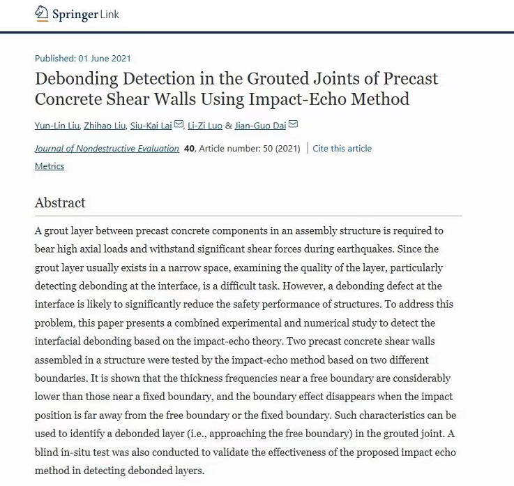 在装配结构中,预制混凝土竖向构件之间的灌浆层需要承受高轴向压力,并在地震中承受较大的剪力。界面处的脱层缺陷可能会显著降低结构的安全性能,由于灌浆层通常存在于狭窄的空间中,检查灌浆层的质量,尤其是检测界面处的脱层是一项比较困难的任务。针对这一问题,团队提出了一种基于冲击回波理论的界面脱层检测方法发明专利:ZL201711074920.8并通过数值模拟和试验及现场盲测验证了该方法的可靠性