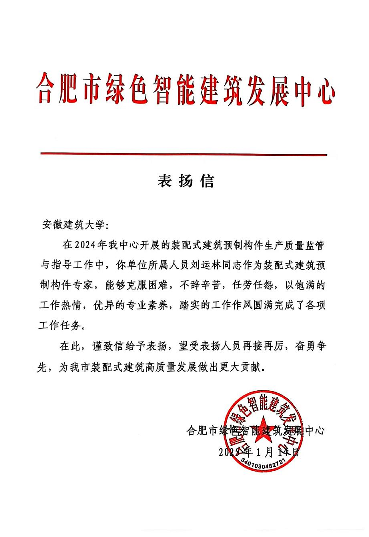 本网讯 近日,学校收到合肥市绿色智能建筑发展中心的表扬信。对刘运林教授在该中心开展的装配式建筑预制构件生产质量监管与指导工作中做出的贡献给予高度赞扬。