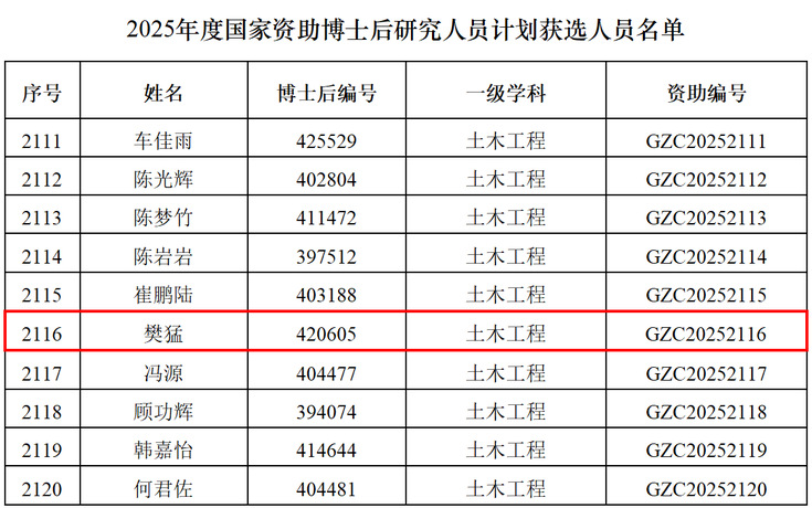 本网讯 近日,中国博士后科学基金会公布了2025年度国家资助博士后研究人员计划(以下简称“国资计划”)B档和C档获选人员名单。经全国博士后管委会办公室和中国博士后科学基金会组织遴选,共有3844人入选。beat365官网在站全职博士后樊猛成功获批“国资计划”C档资助,实现学校在该项目上的突破,标志着博士后队伍建设取得新进展。