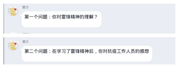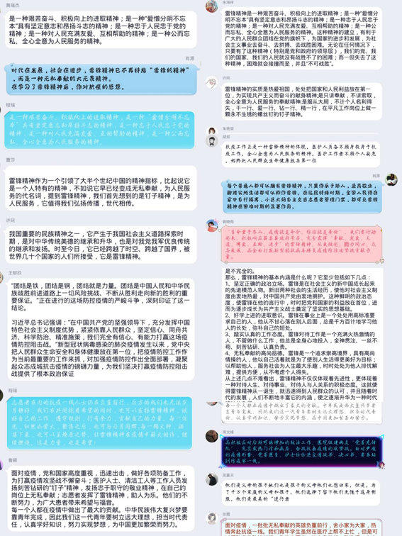 曹莎首先向同学们普及了雷锋同志的生平简介、感人事迹和奉献精神等多方面情况。结合对雷峰的了解,同学们对雷锋精神进行了热烈讨论。团支书结合实事,介绍了疫情期间前线医务工作者和后方志愿者的感人事迹,同学们对疫情期间涌现出的榜样楷模深表敬意,交流分享了为抗疫奔赴一线的逆行者们雷锋精神的所见所闻,有为了抗击疫情主动填写请战书的医务工作者们,有内防外控在高速道口执勤的交通警察们……正是由中国千千万万无私奉献汇聚而成的雷锋精神,才让疫情防控不断显出成效。