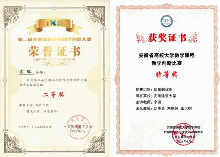 二、强化基础课程教学与人才培养。长期以来,学院教师积极投身教育教学一线,为学校的建设和发展,培养高素质人才做出突出贡献,学院长期承担全校数学类、物理类、物理实验课程教学工作,即便是2020年春季学期突如其来的线上教学,学院教师也能克服困难,不停开一门课程,做到所有课程规范有序开课。学院上下对教学工作高度重视,课程组定期组织集体备课,积极开展课程教学研讨、公开课等教学活动,组建优秀的省级、校级教学团队,2021年刘华勇教授带头的《数值分析》教学团队获批省级教学团队。学院教师积极参加各级、各类课堂教学比赛,以赛促教,提高自身教学水平。李璐副教授2020年荣获“安徽省线上教学名师”称号,2021年荣获“安徽省高校大学数学课程教学创新比赛”特等奖,2022年荣获“第二届全国高校教师教学创新大赛地方高校副高组”二等奖;张学勇教授2019年荣获“安徽省教学名师”称号;严飞、郭冬两位老师荣获“安徽省教坛新秀”称号。