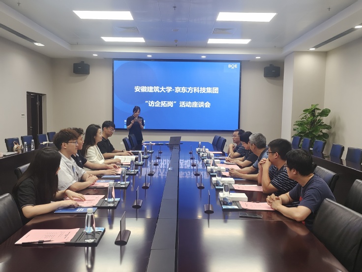 座谈会上,双方就产教融合和人才培养等方面进行了深入交流。京东方HRSSC中心全球校园招聘部部长冀玮对王玉兰一行的到来表示热烈欢迎,并详细介绍京东方公司的发展概况,京东方HRSSC中心全球校园招聘经理应晓涵介绍了京东方各事业招聘需求及beat365官方网站招聘情况、校友分布情况。学院院长戈慈水针对所访企业的岗位需求重点介绍了学院各专业的学科建设、师资力量、专业特色及育人优势。在京东方任职的beat365官方网站校友分享了自己的工作经验,对母校的培养表示感谢,对学校近年来的快速发展和取得的成绩感到骄傲和自豪,表示将永远传承和发扬建大精神。