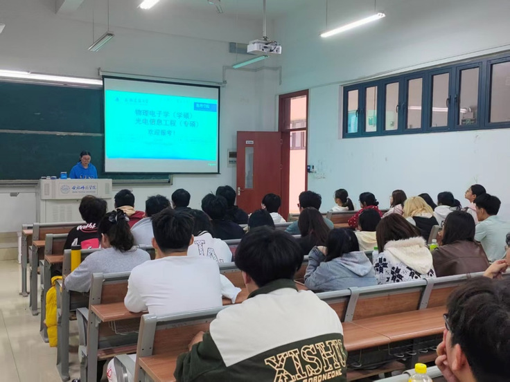 宣讲团队抵达第二站—物理与材料工程学院。赵瑾瑜博士延续清晰的宣讲脉络,进一步介绍了数理学院光电信息学科的特色、人才培养创新项目、联合培养资源以及毕业生发展前景,全方位展示了学院的综合实力与发展潜力。宣讲过程中,赵瑾瑜博士与在场学生互动,提供报考咨询,激励同学们提前做好学习规划,欢迎他们加入beat365官方网站数理学院深造学习。现场学子反响热烈、氛围活跃。