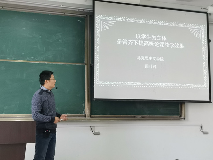 本次备课会首次以主题研讨的方式开展。周叶君老师以《以学生为主体多管齐下,提高概论课教学效果》为题通过具体分析“概论”课的课程概况、教学内容、教学要求、成绩评定等环节,提出提高“概论”课课堂教学效果的三大有效措施:一是针对工科专业00后学生理论基础较弱,但团队协作观念强、思维活跃、行动力强、重感性体验特点,调整教学内容和教学体系,进行专题式教学;二是利用学习通、泛雅网络课堂,进行线上线下混合式教学;三是注重发挥学生主体作用,将学生分成若干小,进行任务导向式教学。通过师生互动、时事微讲堂、小组活动、讲课展示等多种方式让学生体验课堂主角,提升学生的课堂参与度和获得感。