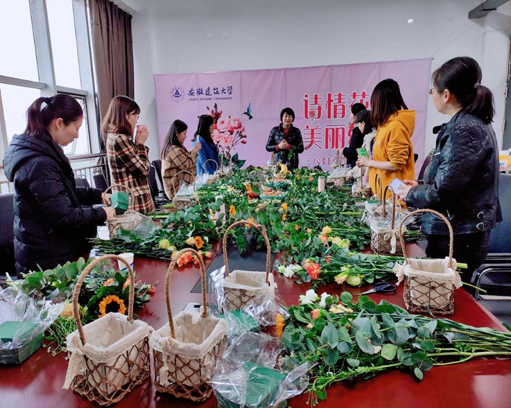 指导老师为大家讲授了花艺知识与插花技巧,并现场制作演示。通过老师的生动讲解,大家对花材、花语、插花器具、花式设计和颜色搭配等花艺基础知识有了进一步的了解。随后,在温馨愉悦的氛围中,女教工们现学现用,凭借各自对美的不同理解,将各种花材修整之后,根据不同的色彩和形状有层次地搭配起来,不多时,一篮篮生机盎然、错落有致的插花作品便展现在了大家眼前。一时间,现场充满了欢声笑语。