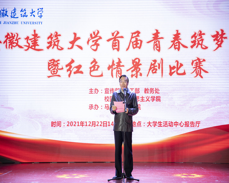 本网讯 2021年12月22日,beat365官方网站青春筑梦剧场暨红色情景剧决赛在大学生活动中心正式举行。比赛采取线上线下同步直播互动的方式举行。校党委书记孙道胜致开幕辞,安徽农业大学马克思主义学院院长黄洪雷、安徽医科大学马克思主义学院院长柳泽民、合肥师范学院马克思主义学院院长吕明、校学生处处长、校团委副书记应邀担任本次比赛评委。宣传部、学生处、教务处、团委以及马克思主义学院等部门负责人出席活动。本次活动由宣传部、学工部、教务处、校团委和马克思主义学院联合主办、马克思主义学院承办。