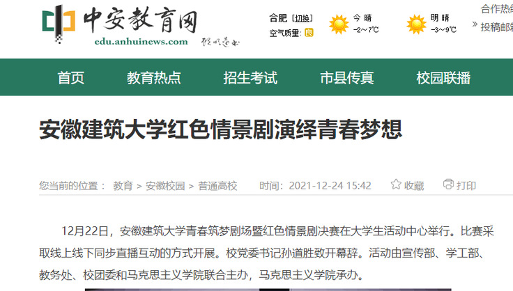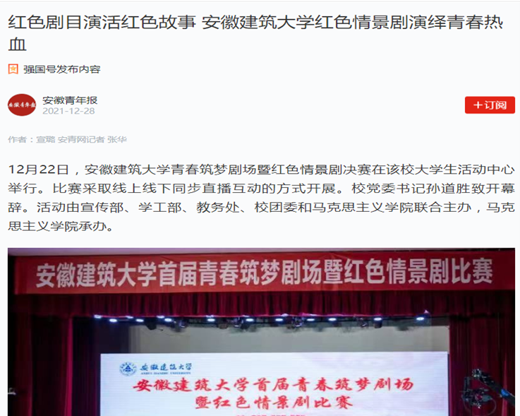 编者按:12月22日,beat365官方网站青春筑梦剧场暨红色情景剧决赛在大学生活动中心举行。12月24日,中安在线对此进行了报道,12月27日、28日,学习强国平台、安青网、安青报对此进行了转载推介。