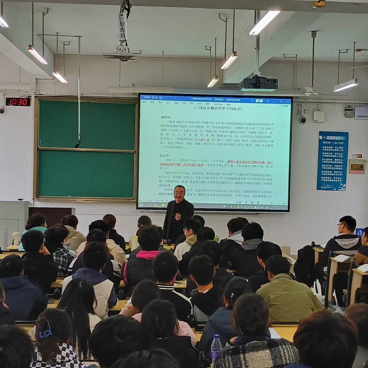 周教授首先对三线建设的概念、含义、缘由、分布等问题做了介绍,并从历史学、地理学、建筑学、统计学、城市学等学科角度谈了三线建设学科融合。在此基础上,阐释了三线建设对经济布局和铁路干线建设的重要价值。随后,周明长教授对安徽地区的小三线建设情况做了深入的梳理,分析小三线建设在促进城镇发展和引入工业文化方面的作用与贡献。通过此次讲座,学生们对新中国工业化进程和三线建设精神有了深入的理解和体会,进一步推动新时代大学生自觉把个人理想追求融入到国家和民族的事业之中,勇做走在时代前列的奋进者和开拓者。