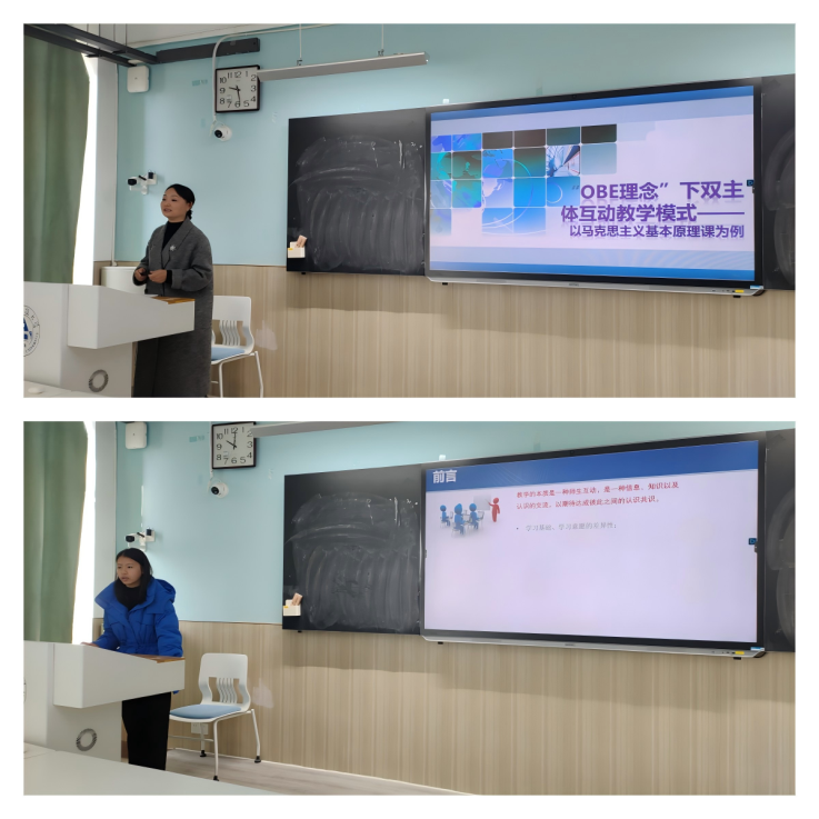 习近平新时代中国特色社会主义思想概论教研室的王景婷老师采取多元化的教学手段,从增强学习的自觉性、拓展思维的广度、培养创新的能力等关键维度入手,引导学生深入理解理论的背景、内涵和意义。原理教研室的周晨老师通过痛点分析,提出以OBE理念,重构教学内容、优化教学设计、创新教学方法,从“硬性灌输”向“问题导向”转变,使学生由被动“容器”向学习“主体”转变。毛概教研室的王亚洋老师通过运用多种教学方式方法把理论知识、情感浸润和行动实践层层递进、逐步提升,做到情理交融,引导学生不断增强对中国共产党和中国特色社会主义的认同。德法教研室的许畅畅老师采用叙事法、比较法、案例法,通过课前任务、课中任务互动、案例剖析等手段,引导广大青年学生勇担民族复兴重任,成就出彩人生。纲要教研室的万思贤老师基于知识图谱展开探究式教学,探索设计了“读-思-悟-融-通”五步混合式教学模式,依托原典史料实证、理性思辨、能力提升、榜样示范,提升“六感”构建了融贯的教学体系。