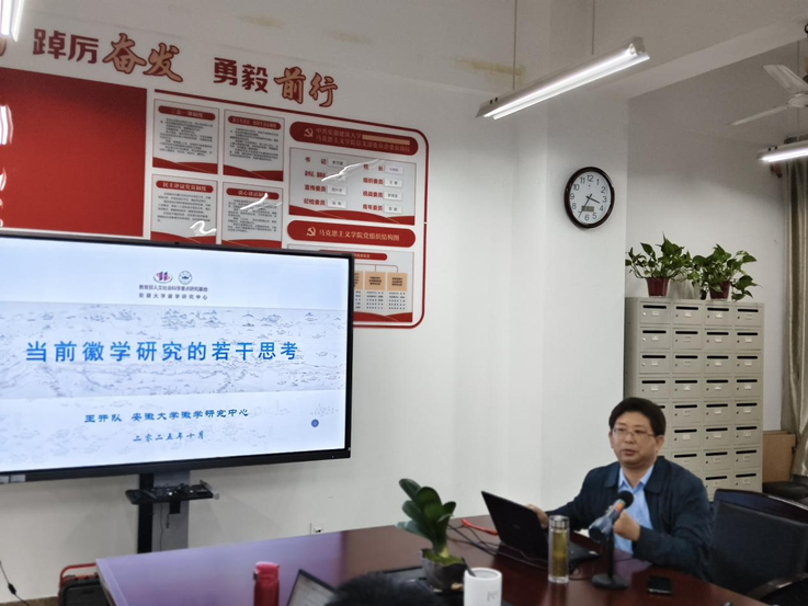 本网讯 10月15日下午,马克思主义学院第19期明德论坛在南校区徽学楼1711会议室顺利举行。安徽大学徽学研究中心教授、博导王开队应邀作“当前徽学研究的若干思考”主题讲座,学院全体教师及建规学院部分研究徽学的教师参加,论坛由学院院长马晓艳主持。