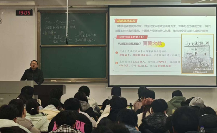 2025年12月10日,校党委常委、副校长高跃峰在5102教室讲授形势与政策课程专题“纪念抗战胜利,坚定民族信念”,引导学子铭记历史、赓续红色血脉。课程以“铭记历史正义必胜”开篇,梳理十四年抗战壮阔历程,强调抗战胜利是近代以来中国抗击外敌入侵的首次完全胜利。高校长结合英雄母亲邓玉芬等事迹,阐释抗战精神的丰富内涵。他指出,学子们要以史为鉴,将抗战精神内化于心、外化于行,以扎实本领为民族复兴贡献青春力量。本次专题课程实现了历史教育与价值引领的深度融合,强化了学子的民族自信与时代使命感。