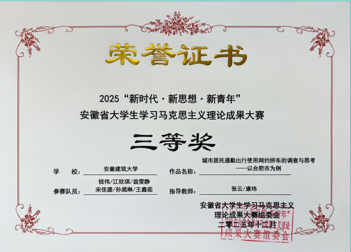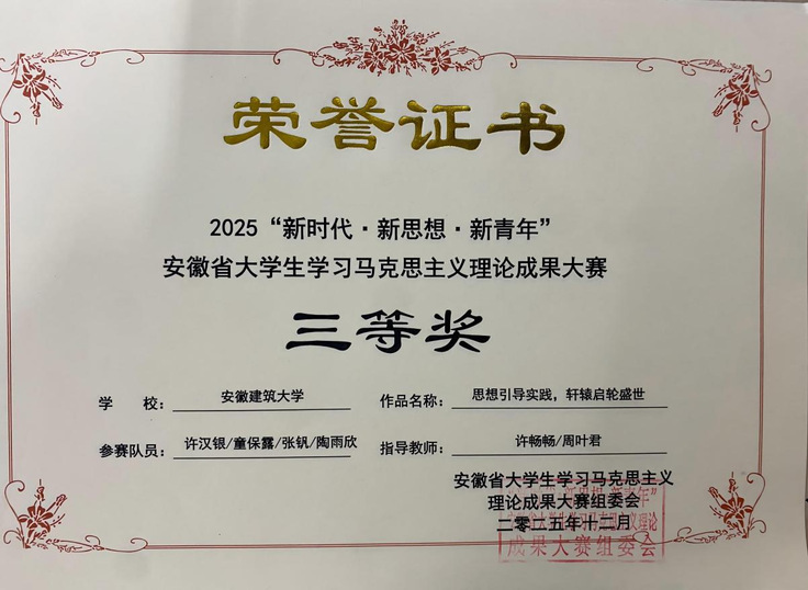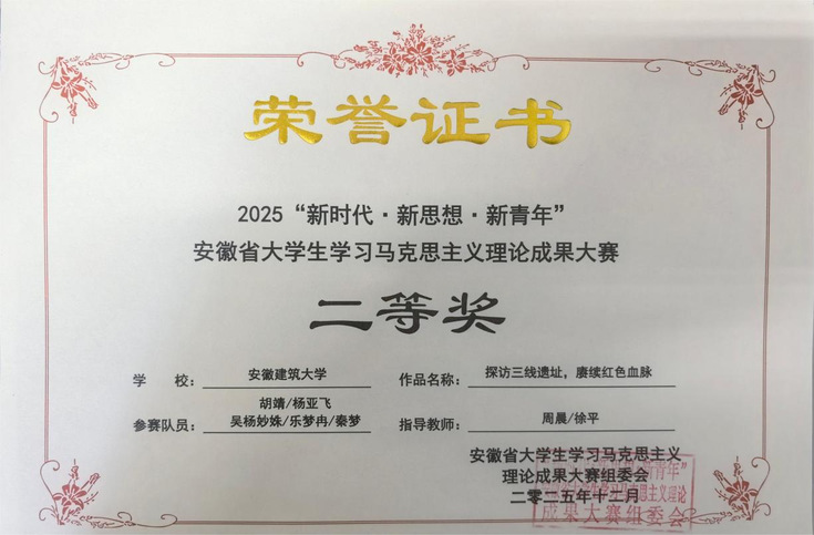 安徽省大学生学习马克思主义理论成果大赛是安徽省高校马克思主义理论类唯一一项AB类赛事,吸引了来自全省众多高校的广泛参与。自启动校级选拔赛以来,马克思主义学院精心组织,参赛学生积极备赛,指导教师认真辅导,对作品进行反复打磨,遴选出优秀作品参加省赛。最终经过省赛专家评审,秦梦团队的社会实践报告《安徽霍山县区域文化资源活化路径优化研究——基于资产评估视角下的小三线文化》荣获一等奖,胡靖团队的微视频《探访三线遗址,赓续红色血脉》荣获二等奖,钱伟团队的社会实践报告《城市居民通勤出行使用网约拼车的调查与思考——以合肥市为例》和许汉银团队的的微视频《思想引导实践、轩辕启轮盛世》荣获三等奖。指导教师徐平、周晨被评为优秀指导教师。