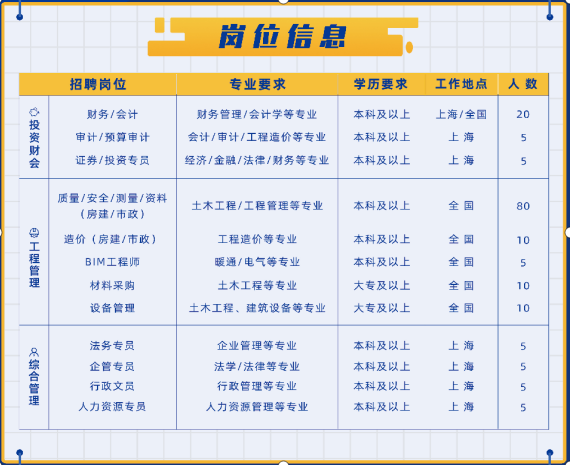 三、招聘专业 土木类:土木工程、工程管理、给排水科学与工程等; 建筑类:工业与民用建筑; 金融学类:金融学、投资学(投资管理); 法学类:法学; 管理科学与工程类:信息管理与信息系统、工程管理、工程造价; 工商管理类:会计学、财务管理、税务管理、人力资源管理、市场营销、审计学。 四、薪酬福利待遇 1.薪酬待遇(岗位工资+地区津贴): 一本院校:6300-6800元税前/月 二本院校:5500-6000元税前/月 2.假期待遇。职工享受的假期包括享受带薪年休假、调休假、婚假、产假、护理假、公益假、哺乳假、计划生育假、工伤假、病伤假、丧假、事假及其他国家法定节假日休假权利。 3.福利待遇。单位为职工缴纳“五险一金”,即:养老保险、医疗保险、失业保险、工伤保险、生育保险、住房公积金。 4.持证津贴。对考取国家相关的执业资格证书和岗位证书给予持证津贴,其中一级建造师津贴4-6.5万元/年,岗位证书、职称证书,给予1000-6000元/年不等的津贴。 5.其他福利待遇。餐补、单人间宿舍(项目部)、通讯补贴、夏令用品、节日福利、体检、团队拓展等。 五、员工培养和晋升 1.员工职业生涯规划。实施员工职业生涯规划,畅通员工职业发展通道, “师带徒”培养模式,充分发挥多方的联动作用规范加速职业人才培养,构建员工职业转换、轮岗机制,帮助员工实现自我价值提升超越。 2.职务晋升。按照操作序列、专业序列、管理序列等不同管理方向晋升。 3.职称晋升。单位具有国家授权的工程系列中级职称评审权。本科毕业生毕业5年可申报中级、毕业10年申报高级、毕业15年申报正高级职称,硕士研究生毕业1年申报中级、毕业6年申报高级、毕业11年申报正高级职称。 六、招聘时间及地点 2020年 9 月 17 日(周四) 15:00 在 逸夫楼5121多媒体教室 举行专场招聘宣讲会,宣讲会现场可直接投递简历,后经筛选通知面试,部分专业安排笔试。面试及笔试合格后签订就业协议。 七、其他事项 1.应聘学生在招聘现场提供以下资料:个人简历、就业推荐表、学习成绩单原件、各类获奖证书复印件等。 2.应聘学生也可将个人简历、就业推荐表、学习成绩单及各类获奖证书扫描件等通过邮件发送到公司邮箱。 3.联系方式: 联系地址:上海市静安区寿阳路99弄8号楼 联系人:姜女士/张女士 联系电话:021-65032295/021-65428005 公司网站:www.lycg.com.cn 简历投递邮箱:campus@lycg.com.cn