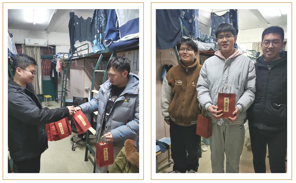 支部书记和党员代表在学生宿舍楼探望考研的同学,送上“助力福袋”,并提醒同学们考前准备、考研时间和考试细节等注意事项。贺卡上“愿你披荆斩棘、如愿以偿”、“此战必胜”等话语承载着党支部成员们满满的祝福,定胜糖上刻的“金榜题名”也汇聚着最美好的寓意。考研路上,党支部是同学们可靠的“战友”,也是温暖的“港湾”。