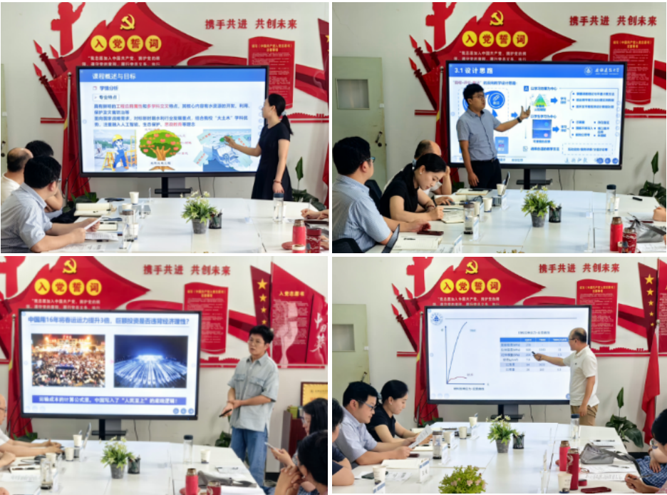 交流会进入核心环节后,参赛教师依次进行课程思政教学片段试讲。从水工建筑物的“工匠精神”融入,到误差理论与测量平差基础的“科技报国”引导,选手们紧扣课程特点,结合实际案例展示了各具特色的思政教学设计。每段试讲结束后,专家们从教学目标设定、思政元素契合度、课堂互动设计等维度展开点评——陈芳聚焦“思政逻辑的连贯性”提出优化建议;黄晓梅结合督导经验强调“课堂生成性”的重要性;戴云彤、周新贵则从创新的视角,分享了“将实践案例转化为思政素材”的实用技巧;葛大丽针对“教学语言的感染力”给出具体改进方法。点评既有理论高度,又具实操性,令在场教师受益匪浅。