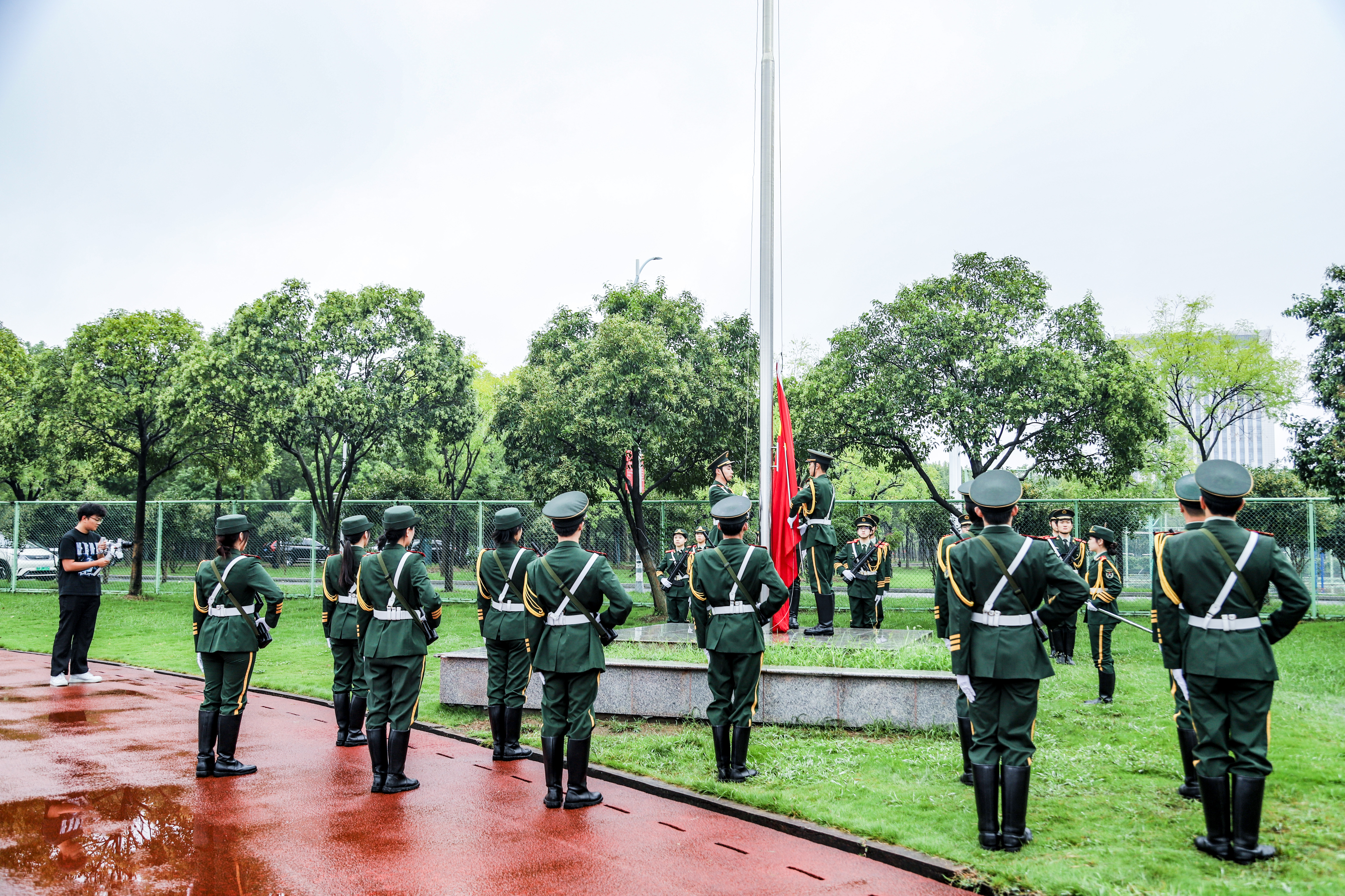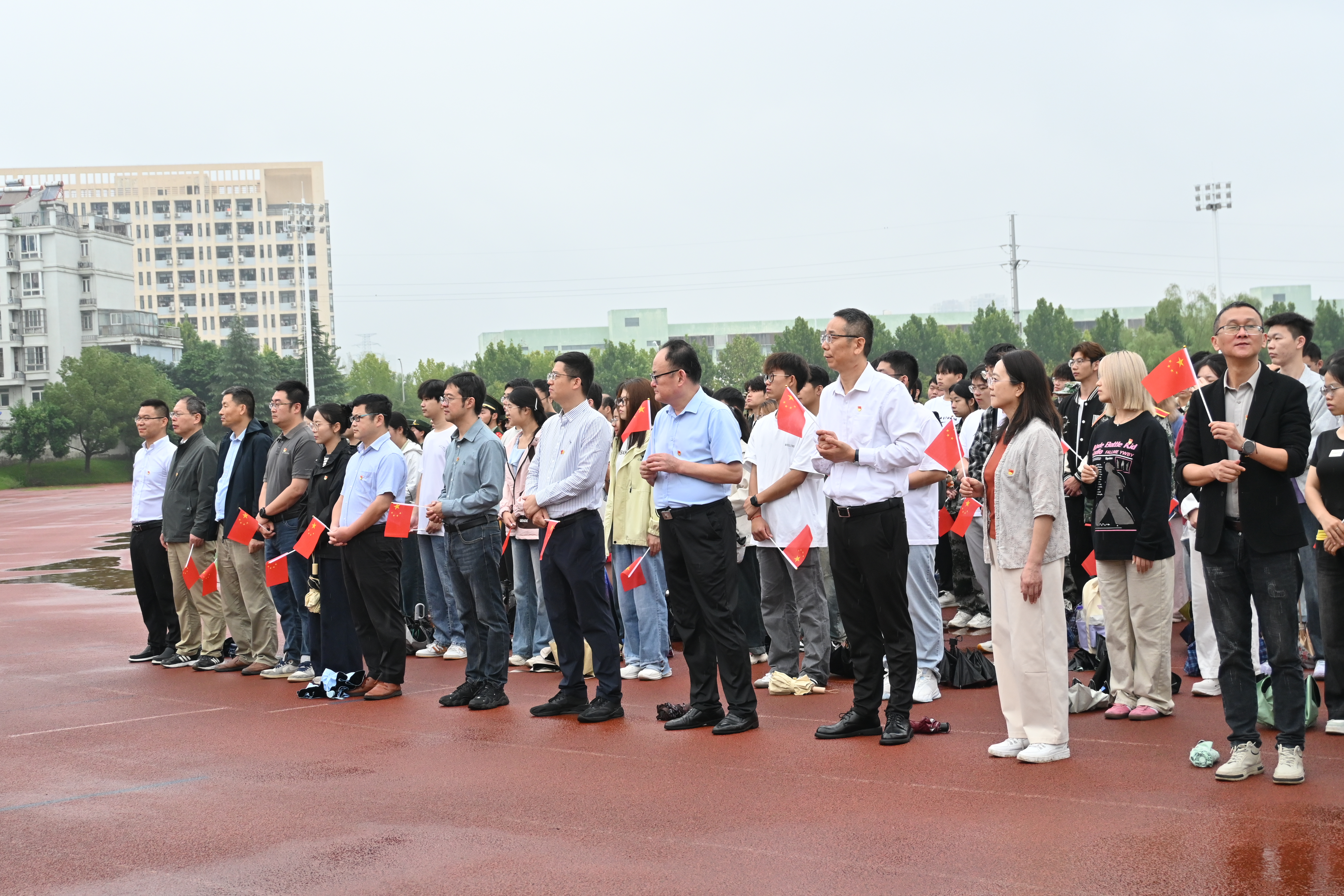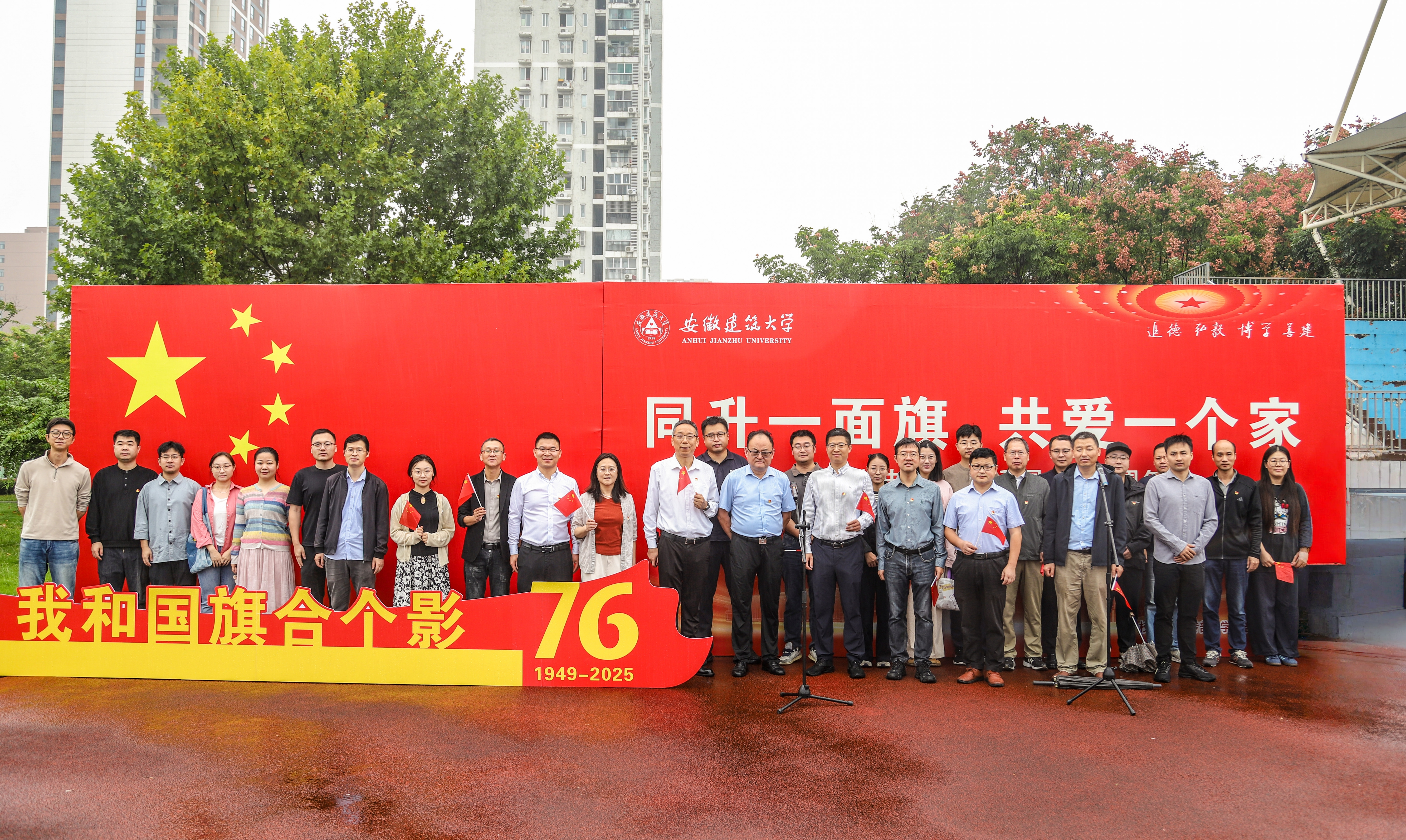 庄严升旗礼赞华诞,厚植家国情怀 清晨7时20分,细雨中的田径场洋溢着“爱党爱国爱校”的浓厚氛围,师生们整齐列队、精神饱满,静静等候仪式开启。7时30分,校团委国旗班成员身着笔挺制服,迈着铿锵有力的正步组成护旗方队从田径场东侧入场,身姿挺拔、目光坚定,每一步都彰显建大学子的昂扬风貌,护送五星红旗缓缓走向旗杆。