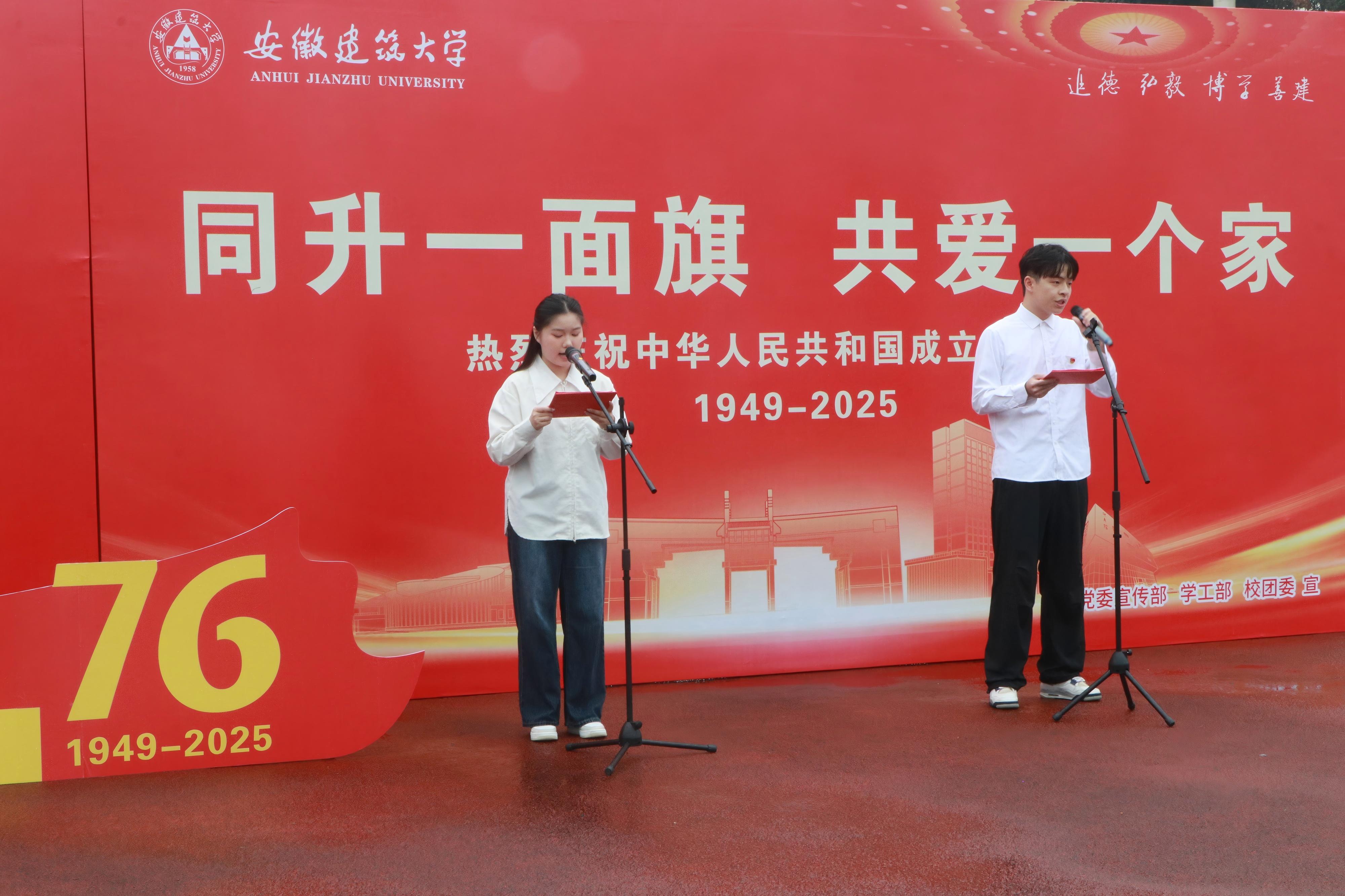 爱国宣言凝聚力量,彰显青年担当 学生代表走上台前开展爱国宣言朗诵,以铿锵有力的语调、饱含深情的话语,回顾祖国76年来的辉煌历程,动情喊出“将爱国情、强国志、报国行熔铸成青春底色”的建大青年宣言,用“请党放心——强国有我!请祖国放心——复兴有我!”的铮铮誓言,抒发新时代青年学子赓续红色血脉、担当强国使命的坚定决心。真挚情感引发全场师生强烈共鸣,进一步强化了师生对家国责任的认知,也呼应了“五进”升旗活动“让国旗覆盖每一个育人场域”的主题,推动爱国主义精神在青年群体中落地生根。