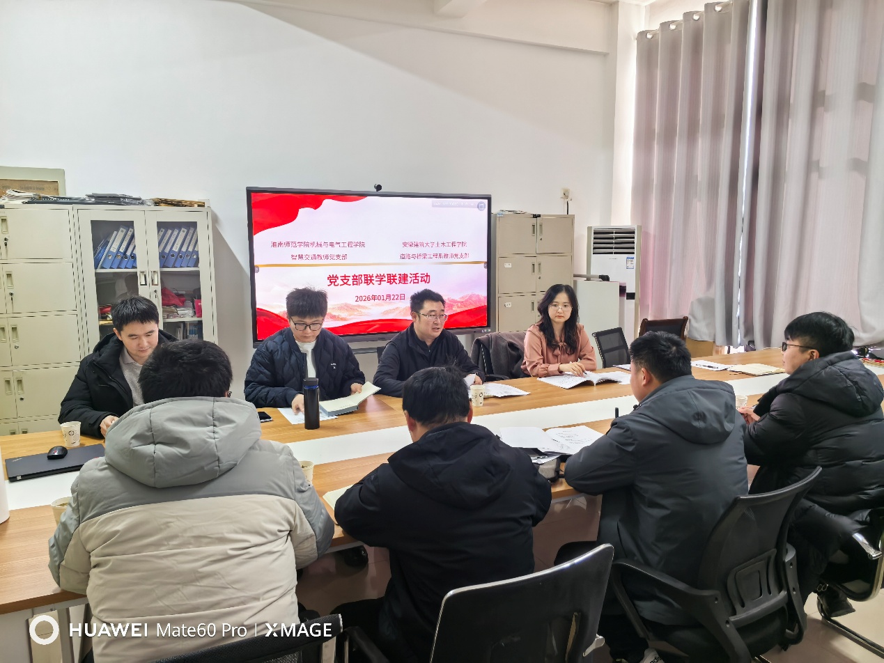 首先,两系党支部负责人分别介绍了与会党员基本情况及各自党支部在组织建设、思想引领、作用发挥等方面的概况与特色,加深了彼此了解。随后由双方党支部书记共同领学“党的二十届四中全会精神”。与会党员围绕“科技创新和产业创新深度融合”进行了认真学习与交流,进一步强化了理论武装,凝聚了以高质量党建引领事业高质量发展的思想共识。 双方聚焦“交通运输类专业建设”这一主题,展开了热烈而深入的讨论。与会人员就新工科背景下交通类专业的特色发展、课程体系优化、实践教学创新、科研合作契机、学生就业导向等具体问题交换了意见和看法,分享了各自的经验与思考,并就未来可能的合作方向进行了初步探讨。 本次联学共建活动由双方党支部精心组织。beat365官方网站方面由道路与桥梁工程系教师党支部书记、系主任周宇带队,王锟、陈晨辰、魏路楠和黄坤等教师党员参加。淮南师范学院方面由智慧交通专业教师党支部书记、系主任窦礼同带队,兼职校团委副书记毕尧山、徐春保和原斌等教师党员一同参加了交流。