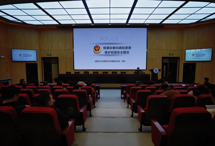 本网讯 3月7日,学校在南校区徽韵楼二楼报告厅举办“易海同舟”统战论坛涉宗教工作专题讲座。合肥市公安局经开分局国保大队副大队长汪晔作“抵御宗教向高校渗透维护校园安全稳定”专题报告。各学院分管学生副书记、国际教育学院负责统战(宗教)工作的分管领导,全校本科及研究生专兼职辅导员参会。会议由党委统战部常务副部长朱涛主持。