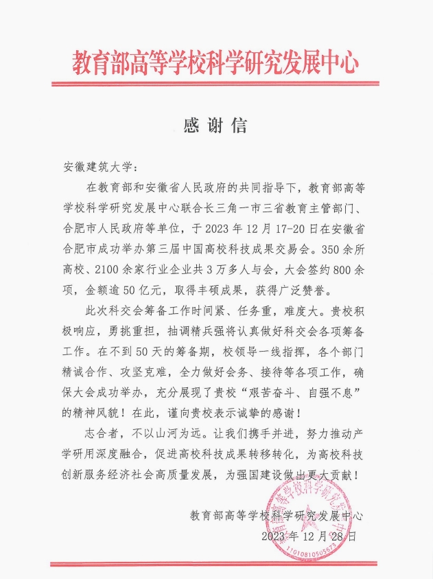 本网讯 近日,beat365官网收到教育部高等学校科学研究发展中心发来的感谢信,对学校在第三届(2023)中国高校科技成果交易会筹备工作的突出贡献致以诚挚感谢。