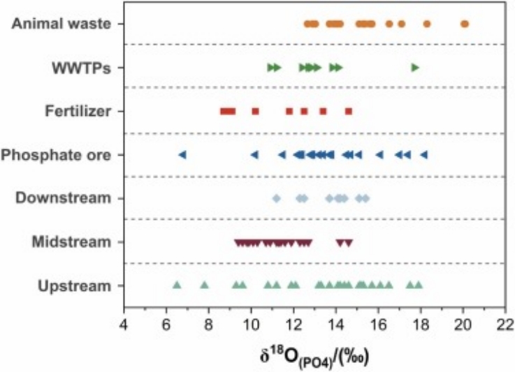 研究以长江流域为对象,综合运用自组织映射、磷酸盐氧同位素及多种受体模型,系统解析了流域内磷酸盐的空间分布、来源构成及其驱动机制。研究发现,长江流域整体水质状况良好,可溶性活性磷平均浓度为0.076 mg/L,磷酸盐饱和度介于18%–95%之间。通过同位素与机器学习融合分析,识别出农业排放、畜禽养殖、磷矿开采以及以污水为主的混合源为主要磷来源。在上游地区,磷矿贡献占比最高(54.7%),中游以农业源为主(66.1%),下游则表现为农业源(48.3%)与混合源(33.3%)共同主导。