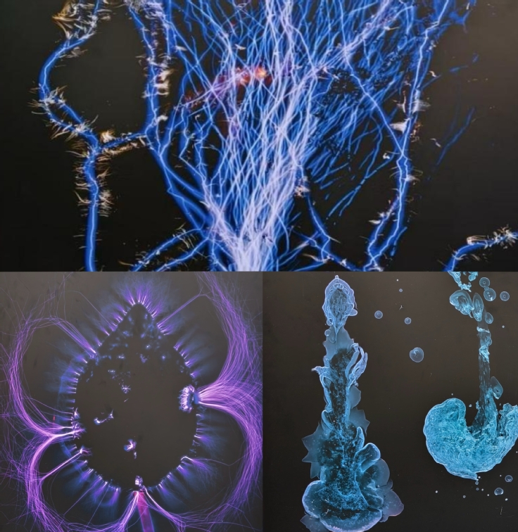 展览现场,一幅幅以科学现象为灵感的艺术作品在金寨路校区“四季大道”文化街区有序陈列。同学们驻足观赏、细细品读,作品兼具观赏性与思想性,生动诠释了科学与艺术的交融之美。《高压放电》作品颇具特色,蓝色电弧如神经网络般在黑色背景上舒展蔓延,交织着白色细丝与红色光点,既彰显电流的动态张力,又暗含自然界“能量流动”的深刻隐喻。此外,冰晶的微观肌理、流体动力学的色彩旋涡、植物细胞的几何美学等作品,借助可视化技术将肉眼难辨的科学现象转化为生动画面,让师生在观展中直观感受自然规律的神奇与人类创造力的无限可能。