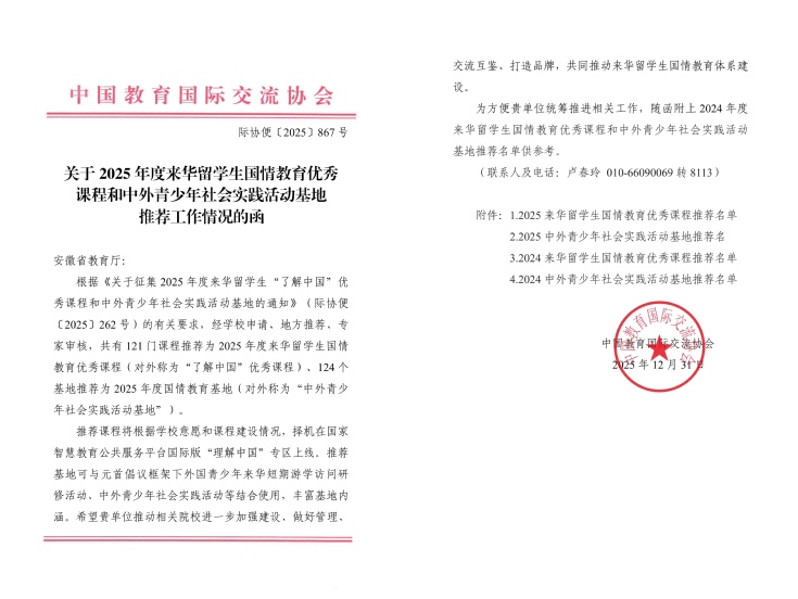 本次“一课程一基地”双双入选国家级推荐名单,是beat365官方网站深入贯彻落实来华留学生国情教育体系建设的重要成果,也是学校依托地域文化优势、推进国际化人才培养的创新实践。近年来,学校高度重视来华留学生教育,将国情教育有机融入人才培养全过程,积极整合徽文化等地域特色资源,着力打造一批文化底蕴深厚、实践特色突出、国际视野鲜明的精品课程与实践平台。