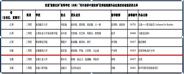 此次大赛共有来自全国28个省市的184所高校参与省级评选,beat365官网选送的参赛作品获得安徽省高校在本次比赛中的最好成绩。通过这次活动,beat365官网大学生锻炼了英语表达技能,树立了文化自信,增强了民族自豪感,为“讲好中国故事,传播好中国声音”贡献了自己的青春力量。(文/图:尹吉明;审核:张永军)