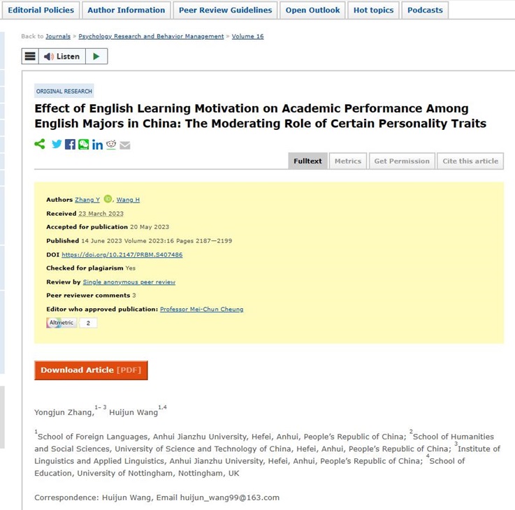 本网讯 近日,外国语学院18级本科生汪慧俊同学在SSCI收录期刊Psychology Research and Behavior Management发表学术论文“Effect of English Learning Motivation on Academic Performance Among English Majors in China: The Moderating Role of Certain Personality Traits”。该论文的指导老师为外国语学院张永军老师。