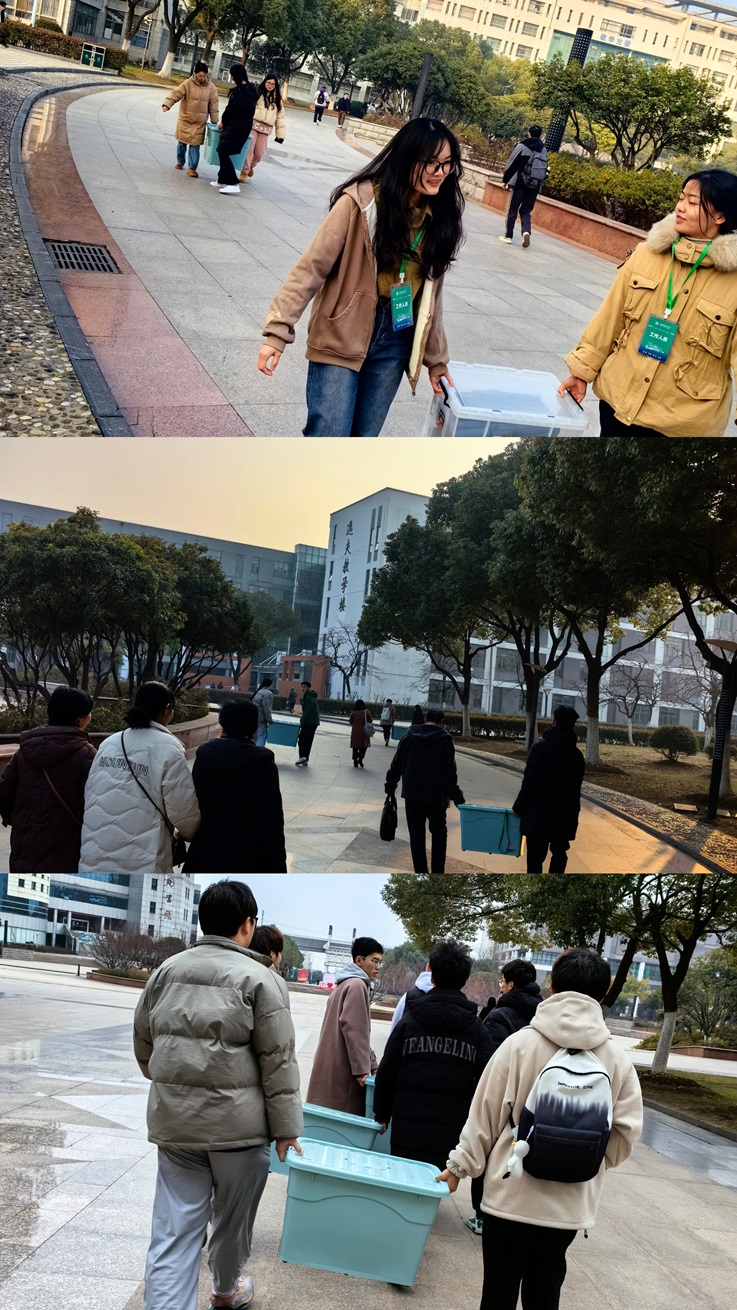 1月10日下午,大学英语读写译1的期末考试,全校4144人参加。南北校区共设置99个考场,分布在逸夫楼、主教楼和F楼。“逸夫楼没有电梯,主考老师一个人扛这么多试卷上五楼太辛苦了!我们年轻,让我们来!”支部预备党员王娜娜说。时间紧,任务重,学生第一党支部主动承担起运送试卷和考试用品的工作,快速分组,分楼层协助主考老师分发试卷和考试用品,确保试卷准时、安全到达每一个考场。考前,学生党员们还对考场环境进行检查、清理,净化考试环境,保障考试运行平稳有序。