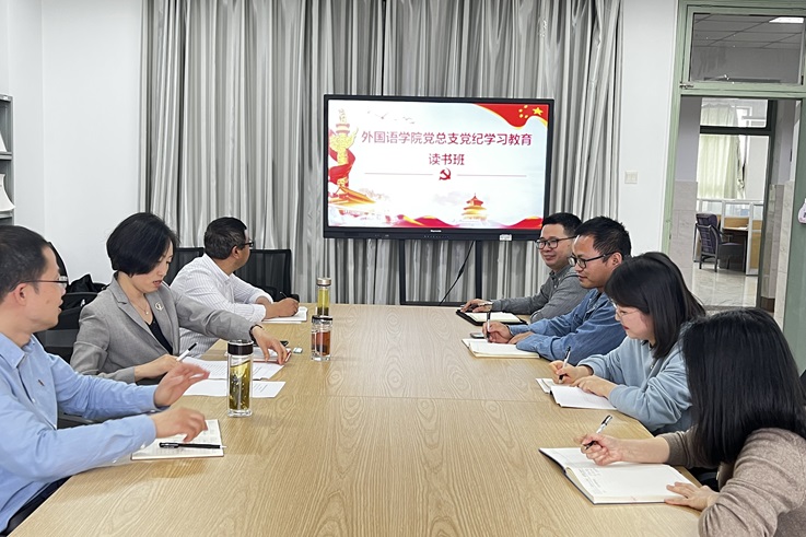 本网讯 4月25日,外国语学院党总支在徽学楼1714会议室召开理论学习中心组第四次学习暨党纪学习教育专题读书班。学院党总支委员、各党支部书记参加会议。