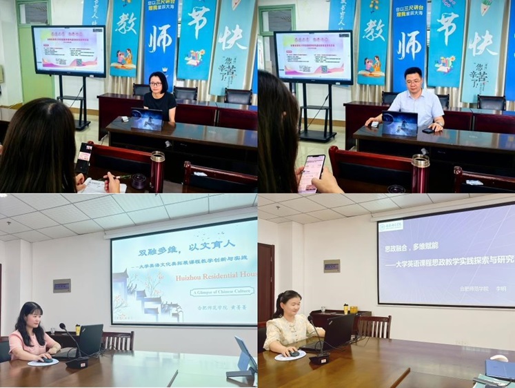 活动的上半场由我院张永军副院长主持。王秀丽老师首先以“面向新工科的大学英语拓展课程建设”为题,介绍了beat365官网新工科背景下大学英语高阶拓展课程体系建设情况;随后,陈月娥老师分享了基于网络自主学习平台的大学英语视听说课程的建设成效。活动的下半场由合肥师范学院外国语学院吴礼敬副院长主持,合肥师范学院黄菁菁老师以“双融多维,以文育人——大学英语文化类拓展课程教学创新与实践”为题,以中国文化英语课程中的徽州民居教学为例,阐述了如何在跨文化交际情境中践行学用合一,从而实现以文育人的教学目标;合肥师范学院李明老师则从“思政融合,多维赋能”的角度,以大学英语精读课程为例,分享了如何在教学实践中实现“润物无声”的课程思政育人理念的宝贵经验。