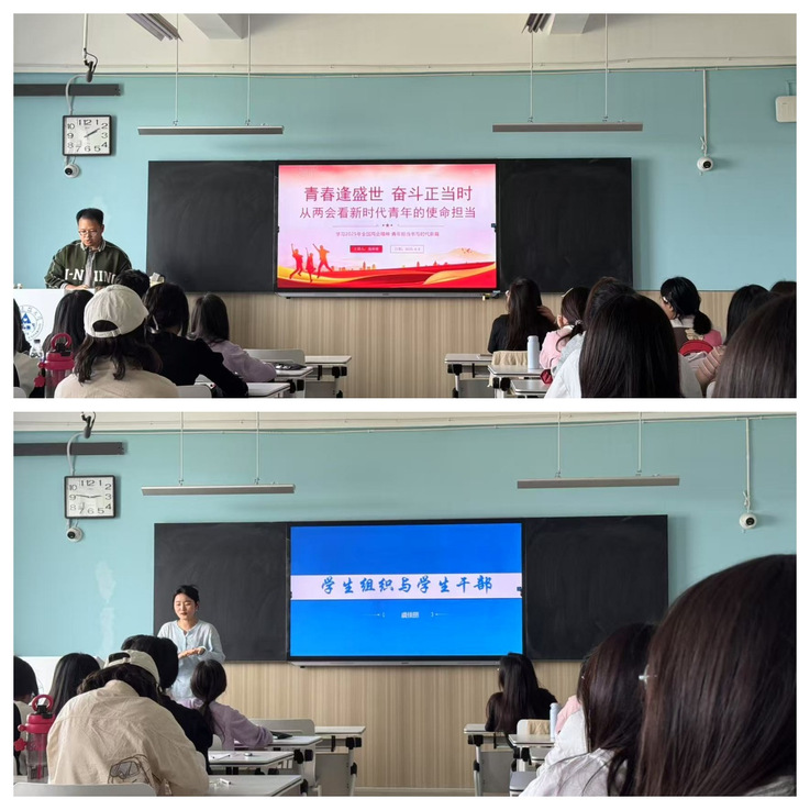 艺术学院辅导员施林坡老师以“青春逢盛世,奋斗正当时—从两会看新时代青年的使命担当”为主题,让同学们加强了对党的认识,以及青年一代在实现中华民族伟大复兴中国梦中的重要作用。他强调,青年一代要勇于直面挑战,要与祖国同心,将小我融入大我。施老师强调青年只有将个人的理想追求与国家的前途命运紧密相连,将个人的成长融入到改革发展的时代洪流中,才能在实现中国梦的生动实践中书写人生华章。施老师的课程让大家深刻感悟到当代中国青年生逢其时,志存高远方能登高望远,胸怀天下才可大展宏图。为使同学们更加了解院学生会的构成,外国语学院团总副书记虞佳丽老师,向同学们介绍了学生干部和学生组织的基本结构及分工,进一步明确了学生干部所充当的角色及需要具备的品德素养。