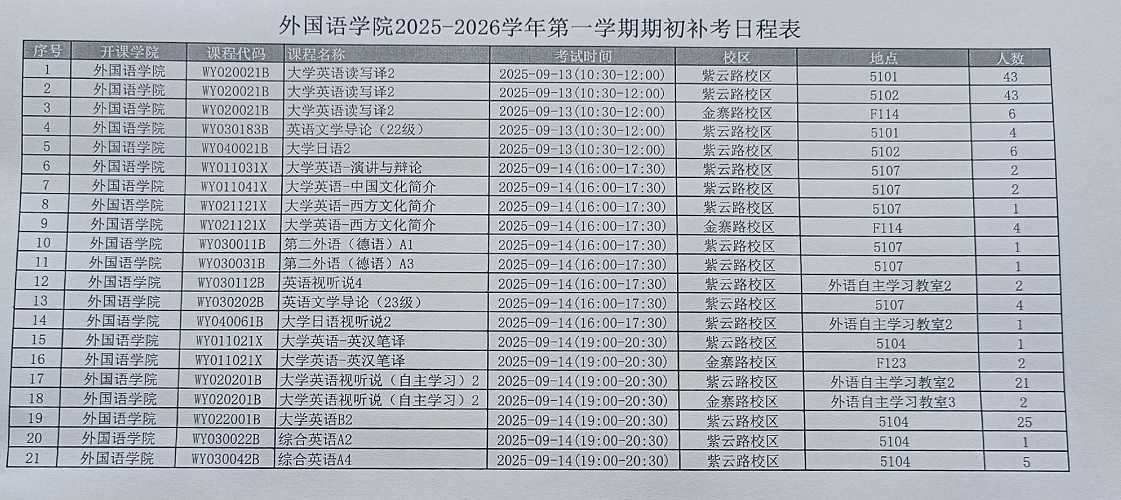 外国语学院2025-2026学年第一学期期初补考日程表