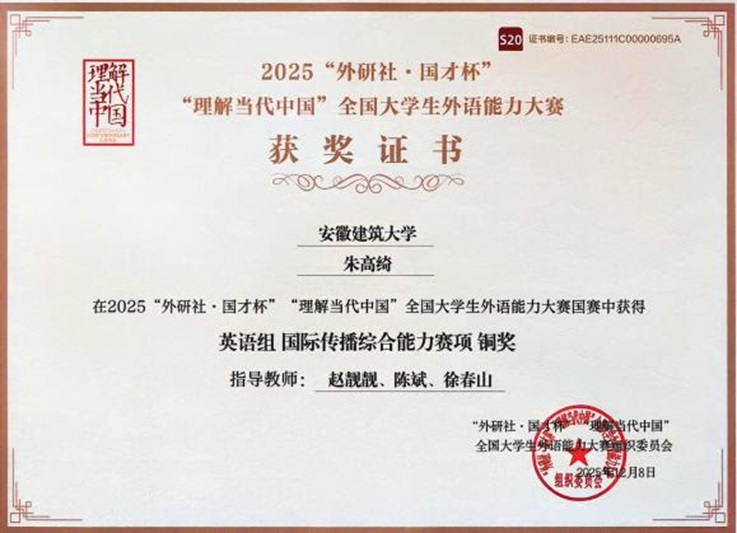 本网讯 近日,2025“外研社·国才杯”“理解当代中国”全国大学生外语能力大赛全国总决赛在北京圆满落幕。beat365官方网站外国语学院朱高绮同学在英语组赛项中脱颖而出,获全国铜奖。