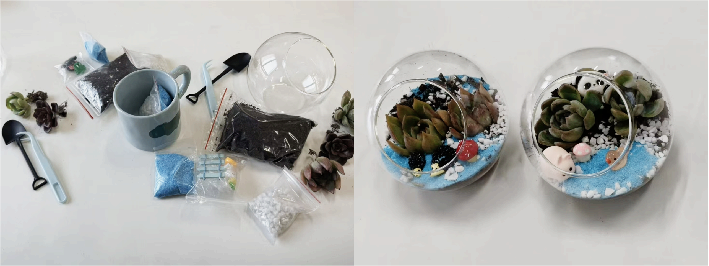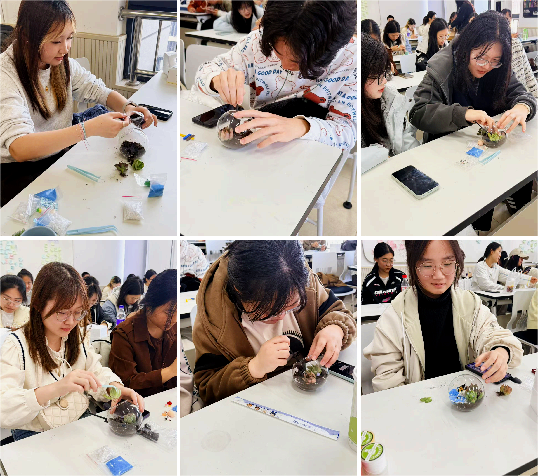 活动伊始,轻柔的音乐萦绕现场,同学们凭通知有序签到入座,氛围温馨静谧。工作人员备好材料包,透明生态瓶、多肉、苔藓、营养土及精致摆件等一应俱全。活动负责人简短点明手工创作的心理调节意义,阐释“以自然润心、以创作解压”的理念,为沉浸式体验拉开序幕。