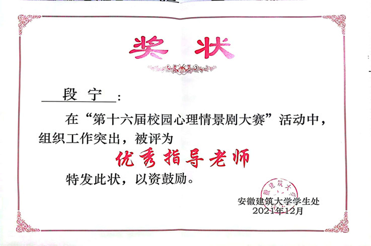 段宁老师荣获第十六届校园心理情景剧大赛优秀指导老师