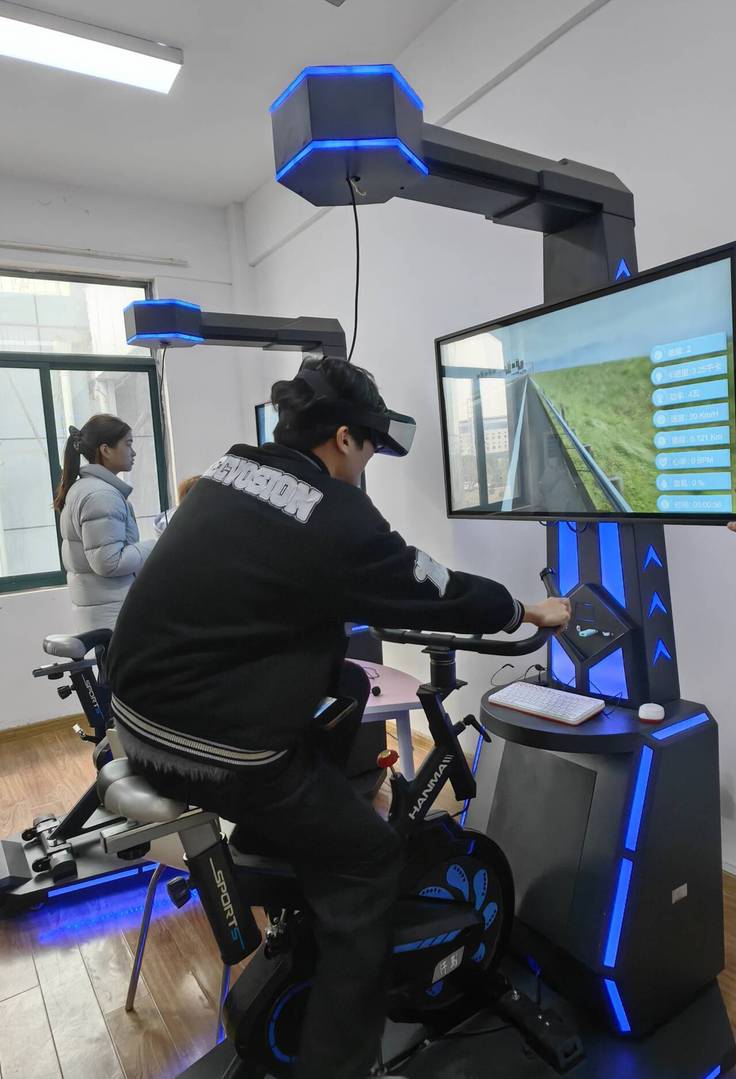 在VR单车体验区,同学们通过佩戴VR设备,在动感单车上进行沉浸式骑行训练。该系统将传统有氧运动与虚拟场景相结合,使体验者能在模拟的海滨、山林等多种环境中运动,有效帮助释放压力、调节情绪,让身体锻炼变得更具趣味性和心理调适价值。
