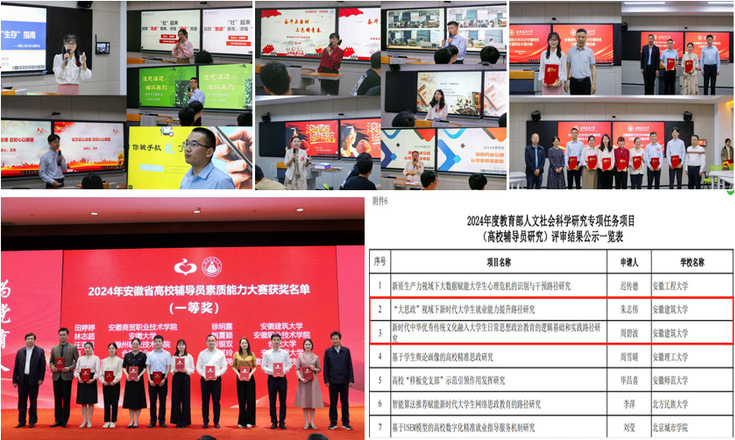 以队伍建设为抓手,提升育人水平。学生处充分发挥学工人队伍的“领头雁”作用、辅导员队伍的“指挥棒”作用和学生骨干队伍的“先锋队”作用,三位一体推进全员育人,不断强化“作为”意识,提升“能为”本领,找准“善为”路径,克服“本领恐慌”。2024年召开学工队伍贯彻落实习近平总书记“3·18”重要讲话精神五周年座谈会。严格按照师生比1:200的要求,引进专职辅导员8名。突出日常培训、强化专题培训、拓宽骨干培训,全年组织国家级、省级和校级辅导员培训220余人次。落实辅导员职称评聘计划单列、标准单设、评审单独的要求,完成8名辅导员申报讲师、副教授职称业务考核工作。按照“请进来教、走出去学、沉下去做”的思路举办“易海会客厅”辅导员沙龙6期,参与师生110人次。举办“秉初心 砺新程 熠未来”辅导员主题班会比赛,“以赛代练”为辅导员提供展示自我、交流互促的平台。落实辅导员日常管理,2024年召开主题班会近1000场次、走访宿舍5200余次、查听课5100余次、天开展谈心谈话6400余次。1人获2024年安徽省高校辅导员素质能力大赛一等奖,2人获批2024年度教育部人文社会科学研究专项任务项目(高校辅导员研究)。在省教育部门的指导下,落实思政委员选拔、培训、考核和评优工作,组织思政委员省级、校级培训610人次,2名思政委员在安徽省高校班级思政委员征文比赛中分别荣获二等奖、三等奖。