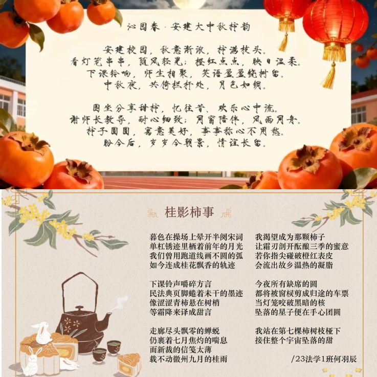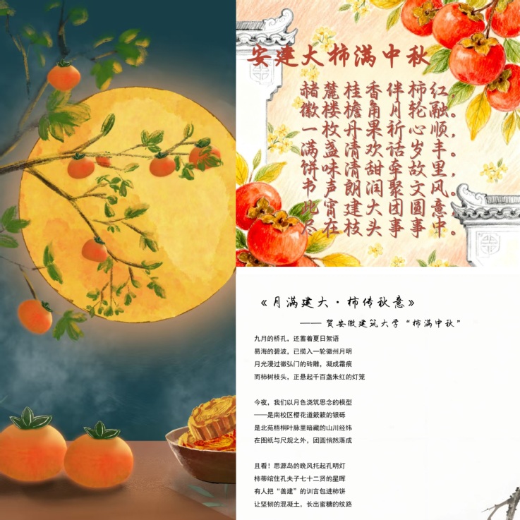 此次获奖学生覆盖2023至2025三个年级,涉及多个专业,大家紧扣“柿满中秋”意象与“语润团圆”内核,巧妙融合安建大校园特色与学科印记。2023级洪亭博以《柿满中秋·语润团圆颂安建大》为题,借“金风拂黉宫”“筑梦土木”等诗句,将校园秋景、专业特色与学府精神融入诗行;2023级何羽辰在《桂影柿事》中,把“民法典墨迹”与“青柿甜意”相牵,用细腻笔触书写乡愁与青春;2024级王子硕以《沁园春·安建大中秋柿韵》勾勒“师生围坐赏柿”的温馨场景,以词牌之雅传递团圆温情。此外,蔡玉《柿映月华,饼藏团圆》、孙澔琳《月满建大·柿传秋意》、邱雅婷《安建大柿满中秋》等作品,也以细腻的视角捕捉了校园里月亮满盈、柿子传香的美好秋景。