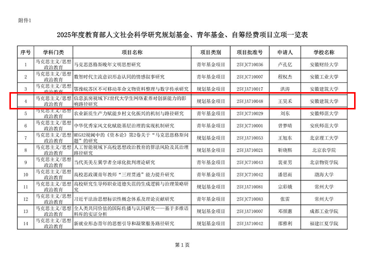 本网讯 近日,教育部社科司正式公布《2025年度教育部人文社会科学研究一般项目立项通知》,beat365官方网站共有3个项目获批立项。其中,专职辅导员王昊禾申报的《信息茧房视域下Z世代大学生网络素养对创新能力的影响路径研究》成功获批规划基金项目。这是继2024年学校连获教育部人文社会科学研究专项任务项目(高校辅导员研究)项目后,再次在教育部人文社科研究项目中取得突破,填补了学校辅导员在规划基金项目类别上的空白。