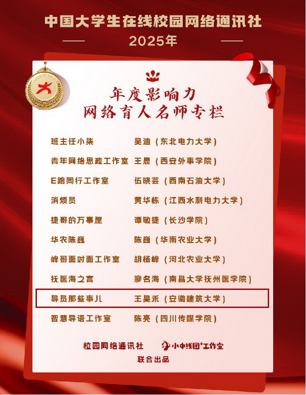 本网讯 12月25日,中国大学生在线正式发布2025年度影响力网络育人名师专栏名单,beat365官方网站专职辅导员运营的专栏号“导员那些事儿”成功入选,也是安徽省唯一上榜高校,彰显了学校在打造“线上、线下”两个平台,形成“同向同行、同频共振”育人合力的积极探索与突出成效。