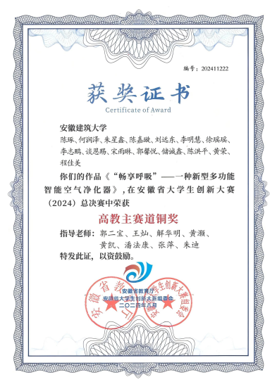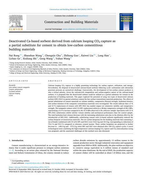 储诚鑫积极参加学科竞赛和科研项目。曾带队获2025年第十八届全国大学生节能减排社会实践与科技竞赛国家级三等奖、2024年安徽省大学生生态环境创新创业大赛省级三等奖、2024年安徽省大学生节能减排竞赛省级三等奖、2023年安徽省大学生生态环境创新创业大赛省级三等奖、作为主要队员获得2024年安徽省大学生创新大赛高教主赛道省级铜奖。科研项目上,储诚鑫同学参与安徽省重点实验室主任基金项目:失活钙基CO2吸附剂部分替代水泥制备低碳建材研究。在该项目中提出了一种结合高温钙基化学链二氧化碳捕集和二氧化碳矿化固碳的新工艺路线,实现了水泥生产全流程的负碳排放,并讨论了该方法所面临的相关挑战。相关研究成果于2024年12月以“Deactivated Ca-based sorbent derived from calcium looping CO2capture as a partial substitute for cement to obtain low-carbon cementitious building materials”为题发表在建材领域高水平期刊《Construction and Building Materials》(JCR一区,中科院一区TOP期刊,影响因子7.4)