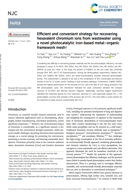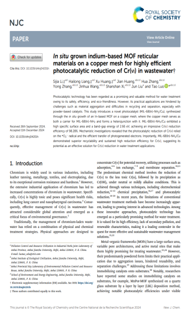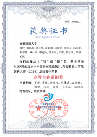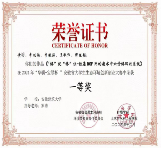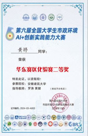 入校以来,他积极参加学科竞赛和科研项目。曾获第九届安徽省“互联网+”大学生创新创业大赛省级铜奖(负责人)、2024年市政创新实践能力大赛——化验赛华东赛区二等奖、2024年市政创新实践能力大赛——虚仿赛华东赛区三等奖、2024年“华骐-宝绿杯”安徽省大学生生态环境创新创业大赛省级一等奖等。科研方面,他先后主持并参与国家级与省级大学生创新创业训练计划项目(大创),依托平台申请实用新型专利1项、软件著作权2项,并参与发表论文2篇《Efficient and convenient strategy for recovering hexavalent chromium ions from wastewater by a novel photocatalytic iron-based metal-organic frameworks mesh》(第三作者),《In-situ growing indium-based MOF reticular material on copper mesh for highly efficient photocatalytic reduction of Cr(VI) in wastewater》(共同第一作者)。