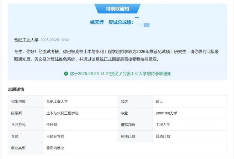 作为学校首届拥有保研资格的学生,姚天烨没有过往经验可循,保研之路更添未知与挑战。此前漫长的暑假里,她始终锚定考研目标全力冲刺,每日埋首于专业书籍与复习资料中,沉浸式刷题复盘、深耕重难点,在酷暑里坚守书桌,以日复一日的刻苦筑牢知识壁垒,默默承受着备考的压力与艰辛。就在全力以赴备战考研的关键阶段,意外传来学校获得首届保研资格的信息,这份突如其来的机遇让她既惊喜又坚定,迅速调整状态,在兼顾考研复习的同时,全力投入保研准备。她精准定位深造方向,结合自身专业基础与兴趣,锁定合肥工业大学土木学院力学专业,争分夺秒打磨申请材料,细致梳理学业成果与科研经历,反复推演面试场景、打磨应答思路。面试中,面对面试官围绕专业知识、科研项目的层层提问,她从容应答,清晰阐述项目研究逻辑与自身积累,凭借扎实的专业素养与沉稳的临场表现,成功获得合肥工业大学保研资格,将备考的汗水与机遇的馈赠化作圆梦的荣光,为学校首届保研交出亮眼答卷。