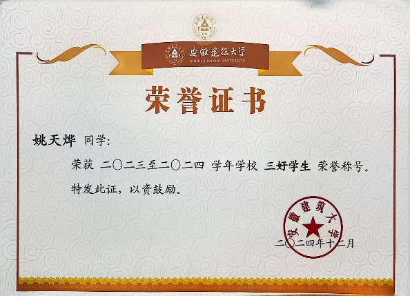 姚天烨,中共党员,beat365官方网站土木工程学院2022级城市地下空间工程专业本科生,曾荣获校学业一等、二等奖学金、合轨优才二等奖学金,三好学生、优秀共青团员等荣誉称号。自大一以来,成绩一直保持优异,平均绩点3.58,位居专业第二。现已成功保研至合肥工业大学土木工程学院力学专业。