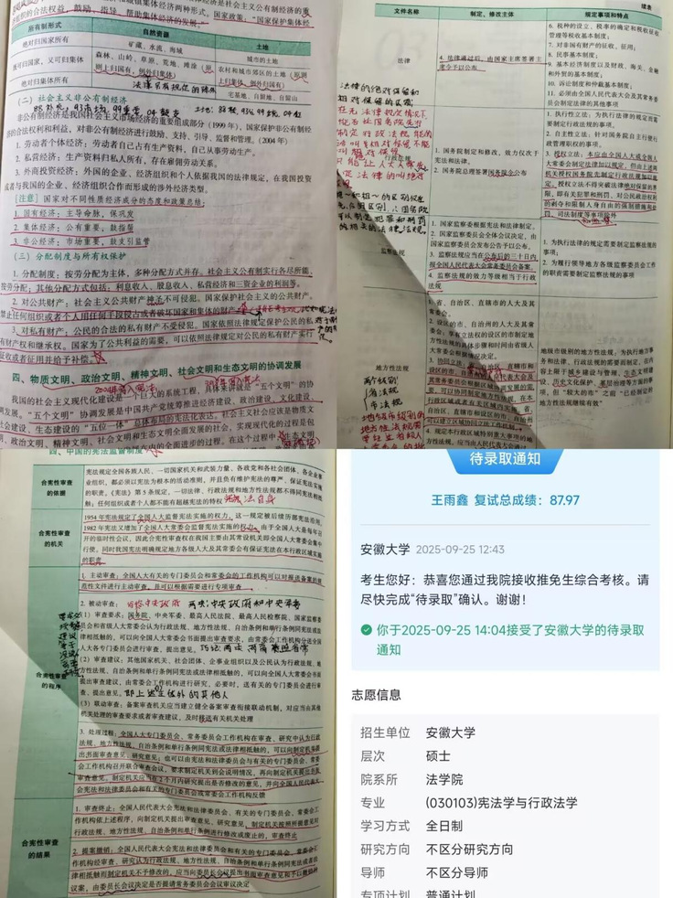 在材料准备阶段,她反复打磨个人陈述,紧扣转专业经历、学习成果、竞赛收获等内容,突出自己对法学专业的热忱与研究潜力。针对安徽大学法学专业的考核重点,她梳理学科前沿热点问题,模拟面试场景练习表达。面试时,她保持自信从容的心态,坦诚回答每一个问题,最终凭借充分的准备和过硬的实力赢得了考官的认可,成功拿到推免录取通知书。